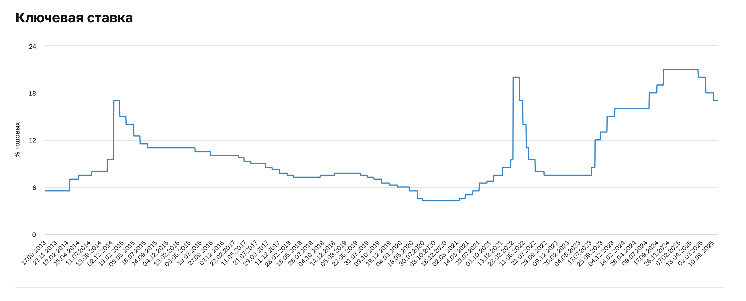 - Когда ситуация стабилизировалась, ставку снижали, но в 2024 году из-за роста инфляции ее пришлось поднять до рекордных 21%.