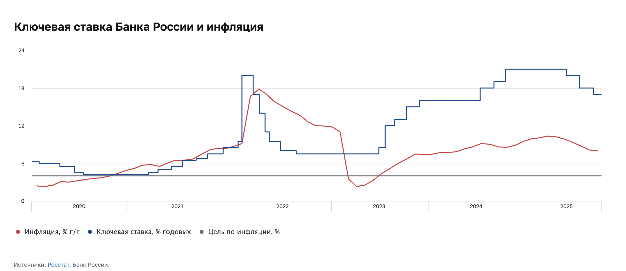 - В 2022 году на фоне санкций и колебаний рубля ставка выросла до 20%, чтобы защитить национальную валюту и сдержать рост цен.