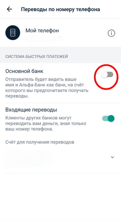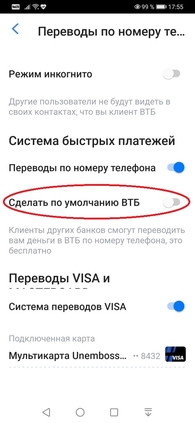 4. Включить опции Переводы по номеру телефона и Сделать ВТБ основным.