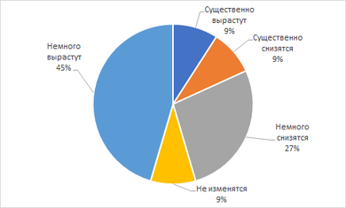 В течение ближайшего полугода 45% компаний ожидают небольшого роста доходов компании, 27% прогнозируют небольшое снижение доходов.