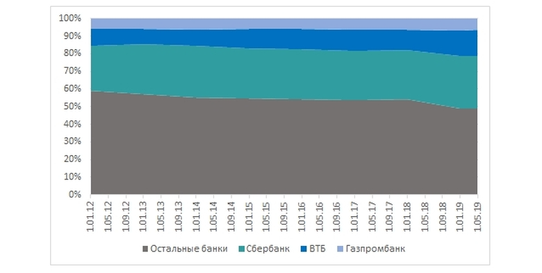 Доля трех самых крупных игроков банковского рынка – Сбербанка, ВТБ и Газпромбанка – в совокупном объеме активов за последние семь лет выросла практически на 10 п. п. и составила более 51% (по состоянию на начало мая 2019 года).