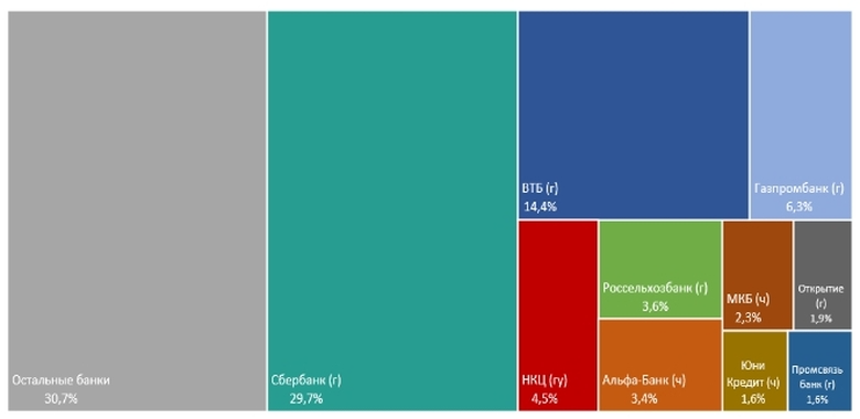 На долю десяти крупнейших банков приходится около 70% совокупного размера активов. Частными из них являются только два – Альфа-Банк и ЮниКредит Банк (доли 3,4% и 1,6% соответственно). Центробанку принадлежат Открытие и Промсвязьбанк. В начале 2012 года общая доля банков из нынешнего ТОП-10 составляла 51%. Тогда как на десять крупнейших на тот момент банков приходилось 57% от совокупного размера активов (в начале 2012 года в ТОП-10 банков по размеру активов входили Сбербанк, ВТБ, Газпромбанк, Россельхозбанк, Банк Москвы, ВТБ 24, Альфа-Банк, ЮниКредит Банк, Росбанк и Райффайзенбанк).