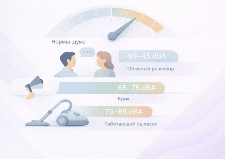 - В ночное время (с 23:00 до 7:00) — не более 45 децибел (дБА).