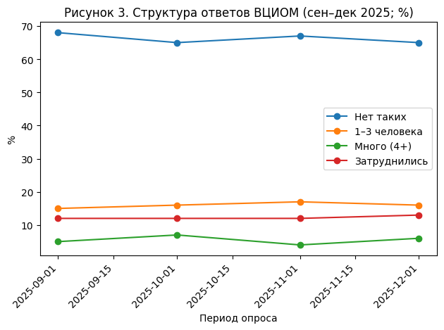 | Период | Нет таких, % | 1–3 человека, % | 4 и более, % | Затруднились, % | Индекс, п. |