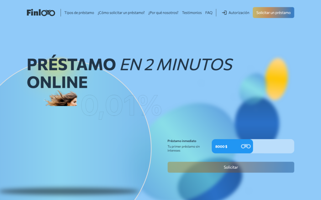Página principal de Finloo.com.mx: calculadora de préstamos, solicitud en 2 minutos y primer préstamo sin intereses.