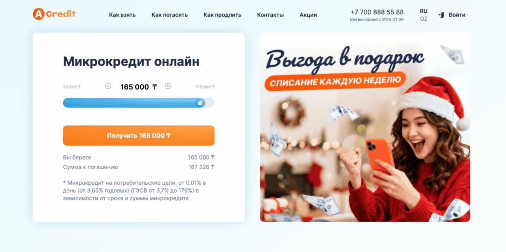 Компания Acredit предоставляет займы круглосуточно. Процесс оформления заявки интуитивно понятен. А время ее рассмотрения составляет всего около 10 минут. Для постоянных клиентов предусмотрены акционные предложения. Подход к каждому клиенту индивидуален. Есть возможность оформить пролонгацию, если не успеваете вернуть всю сумму в срок.