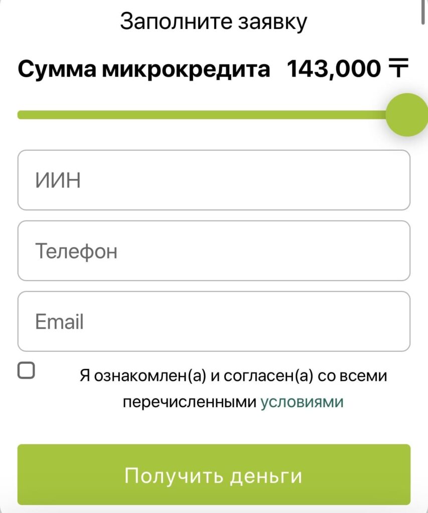 Для получения микрокредита необходимо зарегистрироваться на сайте, указать ИИН, номер телефона и адрес электронной почты. Далее заполняется анкета с персональными данными и выбирается способ получения средств — карта или IBAN.