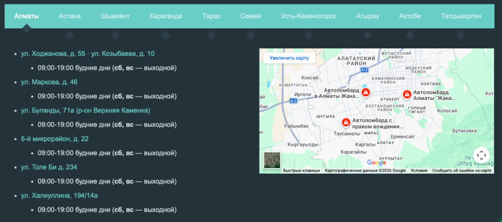 Главный офис находится в Алматы. Филиалы работают в крупных городах Казахстана. График работы: 09:00–19:00.