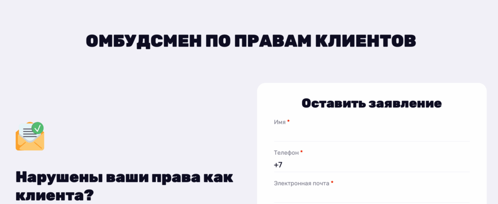 Кроме того, на сайте предусмотрена отдельная форма обращения к финансовому омбудсмену. Через неё пользователь может направить жалобу или предложение, указав имя, номер телефона, адрес электронной почты и суть обращения. Ответ по таким запросам предоставляется в течение семи рабочих дней.
