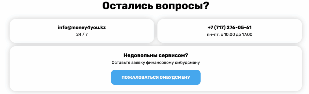 - Почта — info@money4you.kz