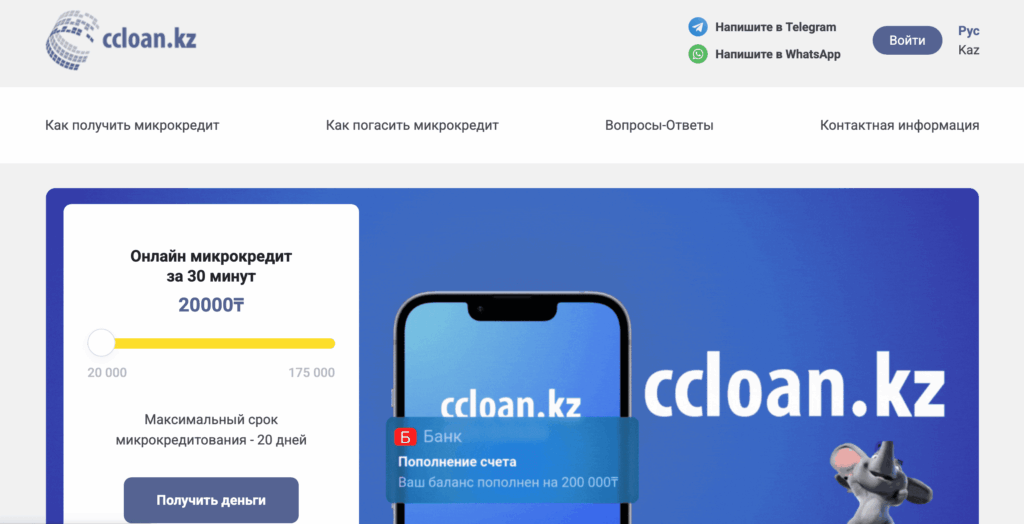 Для получения займа в CCLoan клиент должен быть гражданином или резидентом Казахстана, достигшим 18 лет, иметь действующий паспорт и ИИН, а также постоянный контактный телефон. Для первого займа компания предлагает лимит от 20 до 175 000 тенге со сроком возврата до 20 дней.