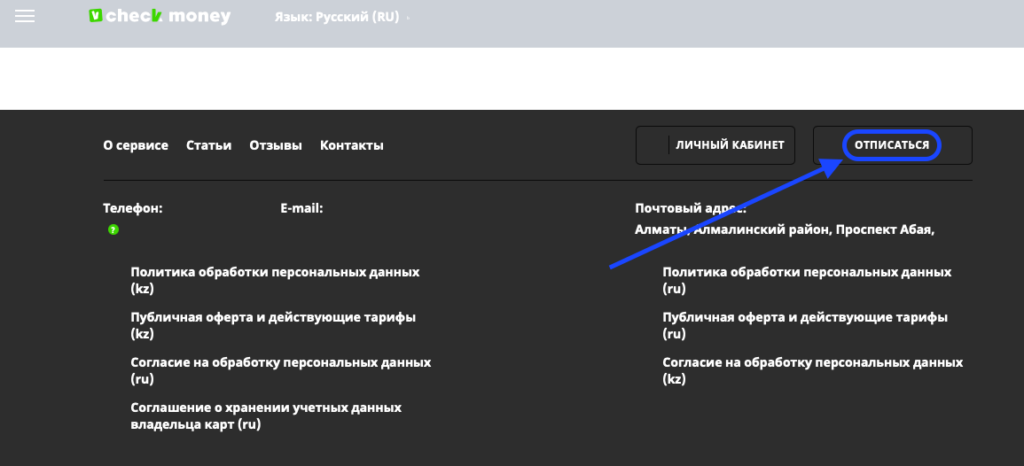 Если в личном кабинете нет соответствующего раздела, нажмите на кнопку «Отписаться», которая находится внизу главной страницы сайта.