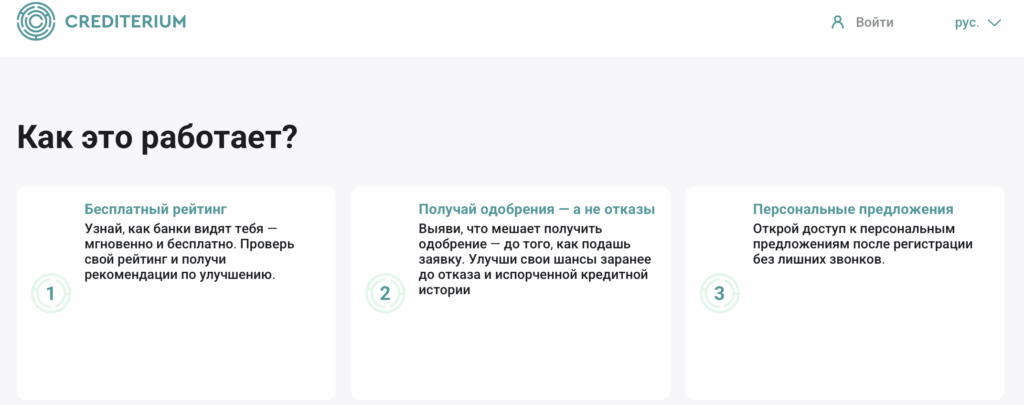 Crediterium.kz — это сервис, который помогает пользователям разобраться со своим кредитным рейтингом, управлять долговой нагрузкой и подбирать предложения от банков. Сама платформа не является кредитным бюро и не выдает займы. Представленный на сайте рейтинг рассчитывается по внутренней методике ТОО «Credit Counseling Services» и носит информационный характер.