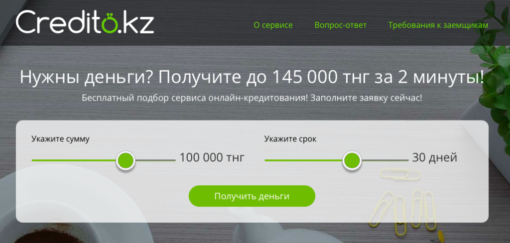 https://credito.kz — официальный интернет‑ресурс сервиса подбора займов, где можно заполнить анкету и подобрать предложения от партнерских МФО.