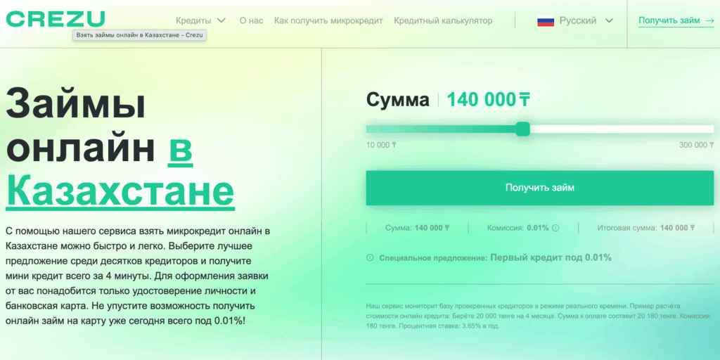 Crezu — онлайн-сервис подбора микрокредитов в Казахстане. Платформа анализирует условия десятков лицензированных кредиторов и показывает варианты, соответствующие запросам пользователя. Сервис быстро подбирает предложения по сумме, срокам и требованиям, а затем направляет заявку выбранному кредитору для одобрения.