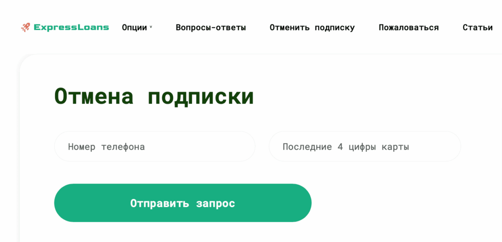 Основной и наиболее удобный способ отказаться от платных услуг Express Loans — воспользоваться формой отмены подписки, размещенной на официальном сайте. Для корректной отправки запроса потребуется указать следующую информацию: