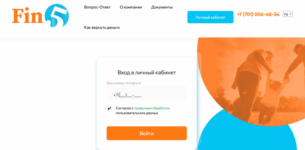 На главной странице Finfive.kz в верхнем правом углу выберите кнопку «Личный кабинет». В открывшейся форме укажите номер мобильного телефона, который был использован при регистрации или оформлении займа, и подтвердите вход через SMS‑код. Эта процедура позволяет безопасно авторизоваться без ввода сложного пароля.