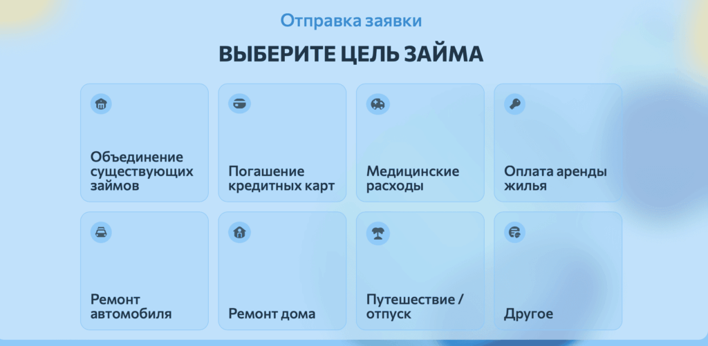 - Выбрать цель займа (например, погашение кредитных карт, оплата аренды жилья, ремонт, путешествие или другие расходы);