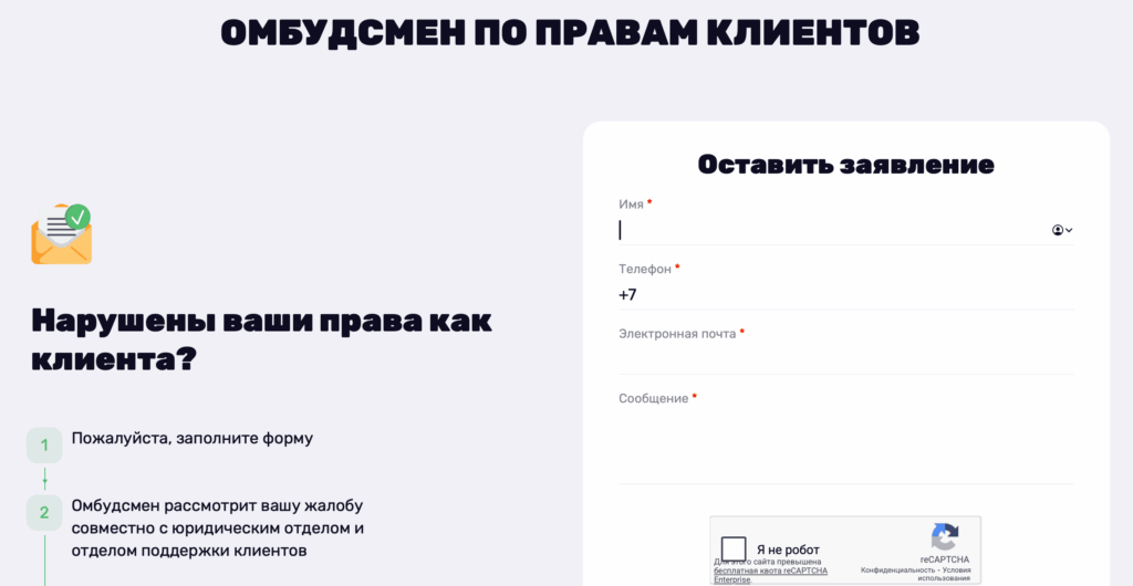 - форма обращения к омбудсмену для подачи жалобы или предложения;