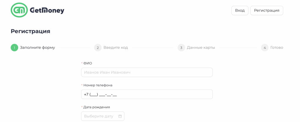 Для регистрации в личном кабинете Get Money необходимо заполнить анкету, указав следующие данные:
