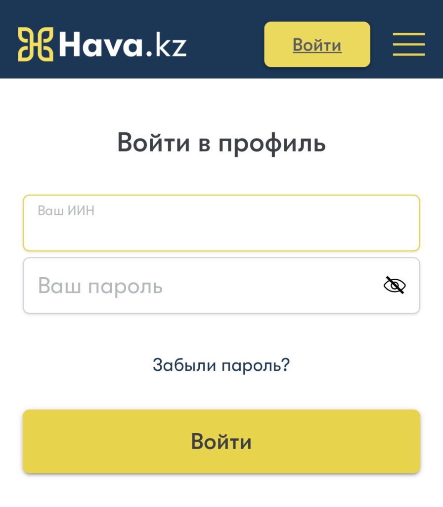 Вход в личный кабинет Hava Finance осуществляется по ИИН или электронной почте. Также нужно ввести пароль.