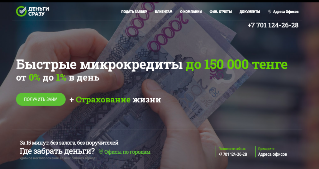 Деньги сразу — казахстанская микрофинансовая организация, предоставляющая краткосрочные займы физическим лицам по всей Республике Казахстан. Компания работает без залога и поручителей, оформляя микрокредиты быстро и просто за минимальное время, чтобы вы могли закрывать финансовые потребности до зарплаты или в экстренных ситуациях.