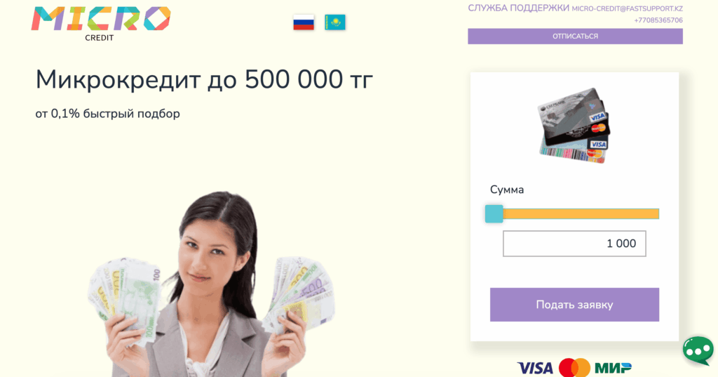 Суммы займов в Micro Credit варьируются от 1 000 до 500 000 ₸, сроки от 1 до 1 800 дней, ставка составляет от 0,1 % в день.