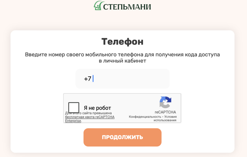 Чтобы войти в личный кабинет СтепьМани, необходимо указать номер телефона, который использовался при заполнении анкеты. После этого система отправляет одноразовый код подтверждения, который требуется ввести на сайте. При корректном вводе кода пользователь автоматически попадает в личный кабинет, где отображается информация по заявке и доступные предложения.