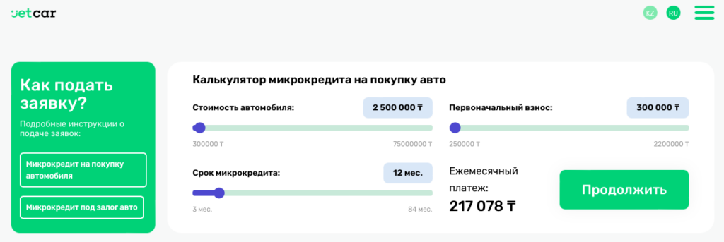 - сумма — от 300 000 до 78 000 000 тенге (на покупку авто);