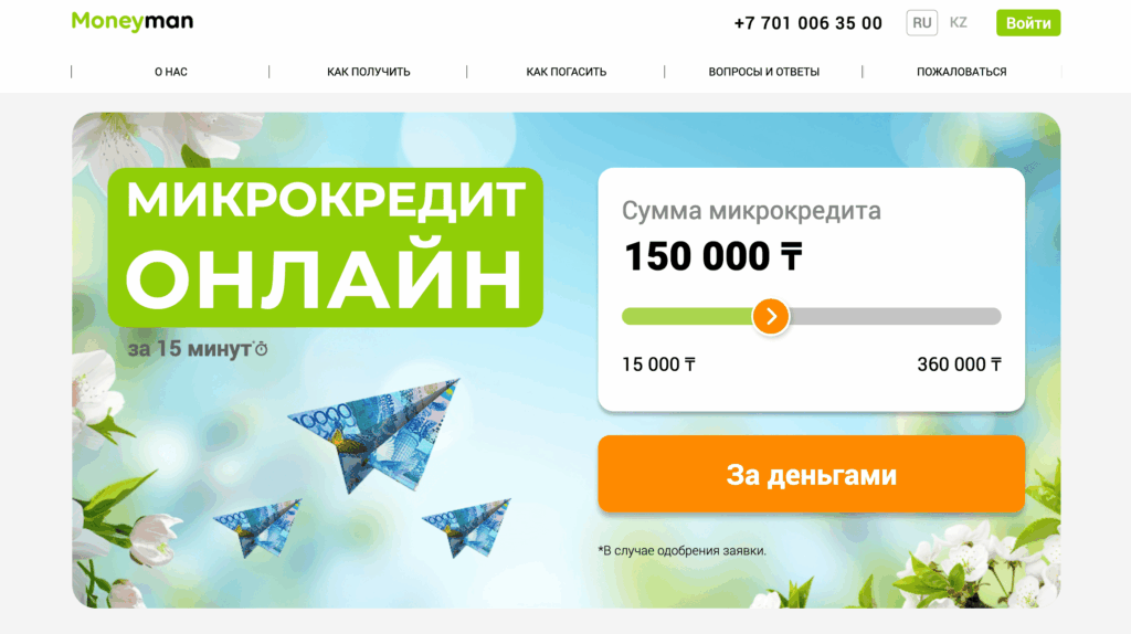 MoneyMan — казахстанская микрофинансовая организация, предоставляющая быстрые онлайн‑микрозаймы гражданам Республики Казахстан через интернет‑сервис. Займ можно оформить полностью дистанционно без визитов в офис, а решение по заявке обычно принимается автоматически в течение нескольких минут.