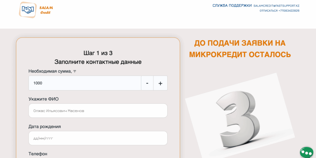 Отдельная регистрация на сайте Salamcredit KZ не требуется. Для получения подбора микрозайма достаточно заполнить заявку онлайн, указав персональные данные и контактный телефон.