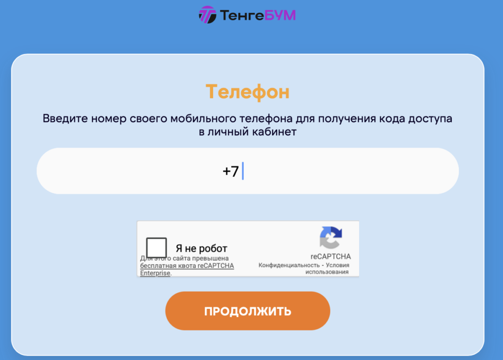 Доступ к личному кабинету ТенгеБум осуществляется в онлайн-режиме через официальный сайт сервиса. Для входа используется номер мобильного телефона, указанный при оформлении заявки.