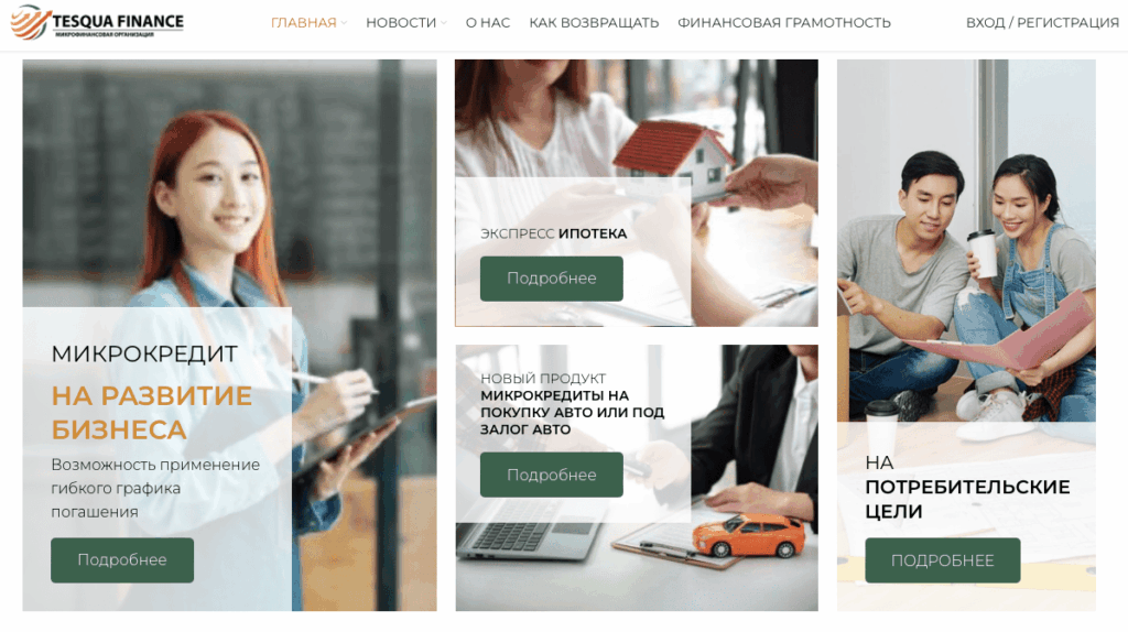TESQUA FINANCE — казахстанская микрофинансовая организация, специализирующаяся на онлайн-микрокредитах и выдаче займов под залог (в основном — недвижимости). Компания обещает оперативное одобрение, гибкие графики погашения и займы как для потребительских целей, так и для предпринимателей.