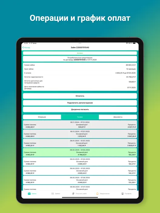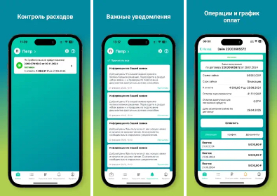 - Просмотр текущих займов, графика платежей и статуса выплат;