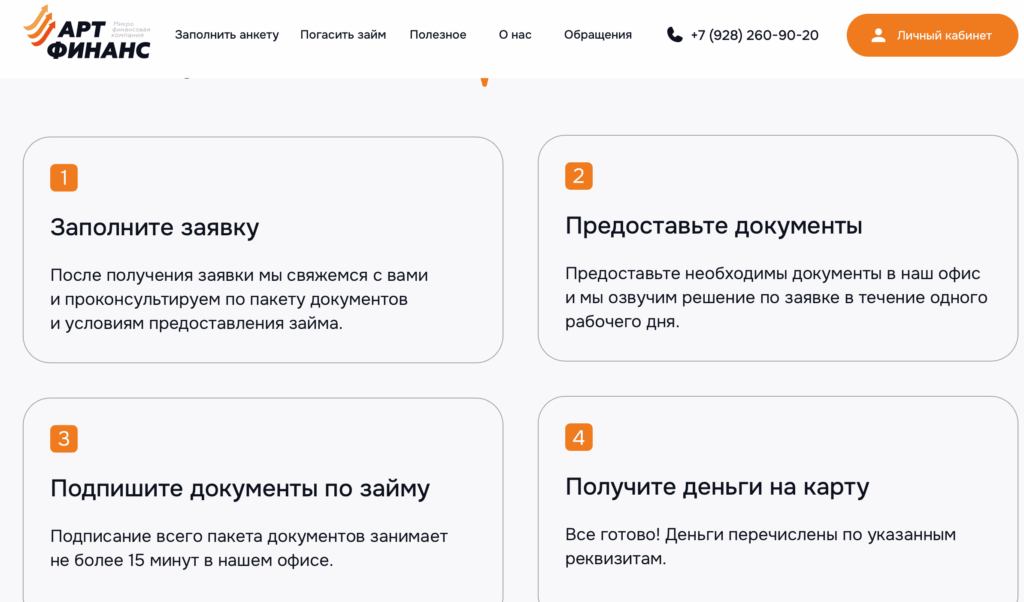 На официальном сайте АртФинанс доступна вся актуальная информация о продуктах компании. Пользователи могут заполнить анкету, ознакомиться с условиями займов, воспользоваться формой погашения и получить ответы на часто задаваемые вопросы.