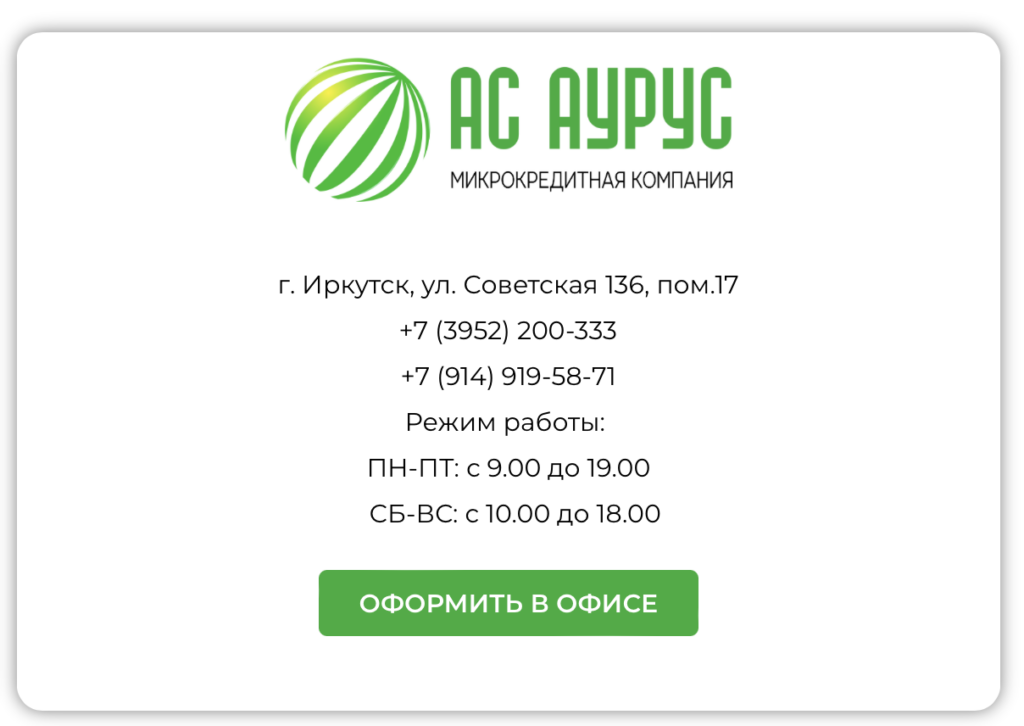 Головной офис АС АУРУС расположен по юридическому адресу в городе Иркутске. Компания не использует большую сеть филиалов, однако принимает клиентов очно в основном офисе.