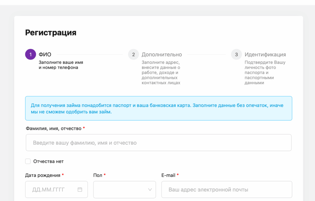 Регистрация личного кабинета происходит в процессе оформления заявки на микрозайм.