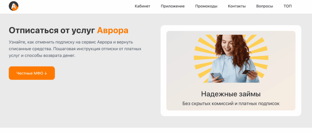 - Перейдите на страницу отмены подписки Аврора займ.