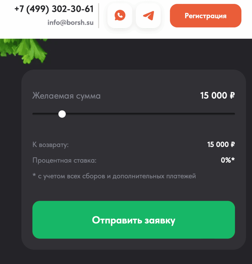 Поскольку сервис не осуществляет кредитование и не принимает решений по выдаче займов, получение лицензии микрофинансовой организации для его работы не требуется. Все финансовые услуги оказываются партнерскими МФО, которые имеют необходимые лицензии и собственные условия предоставления займов. Борщ Кредит выполняет посредническую и информационную функцию, не вмешиваясь в кредитные отношения сторон.