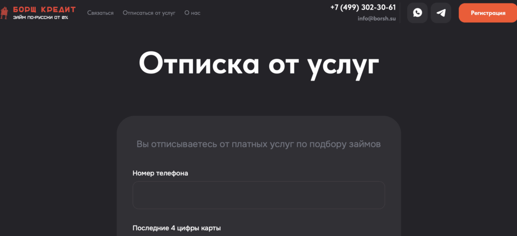 Форма отписки доступна на официальном сайте Борщ Кредит. Ссылка «Отписаться от услуг» размещена в верхней части сайта и видна сразу при открытии страницы. После перехода нужно заполнить данные и нажать кнопку «Найти и отписаться».