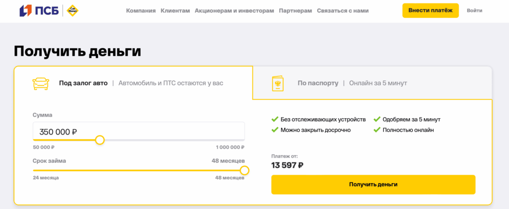 Сервис ориентирован на клиентов, которым необходимо получить крупную сумму под залог транспортного средства либо небольшую сумму без обеспечения. Все ключевые этапы — от подачи заявки до получения денег — могут проходить онлайн.