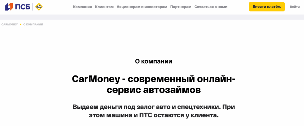 Юридическое лицо — ООО МФК «ПСБ Финанс». Компания предоставляет микрокредиты физическим лицам и действует в соответствии с требованиями законодательства РФ. Основное направление деятельности — автозаймы с возможностью дистанционного оформления через сайт или мобильное приложение.
