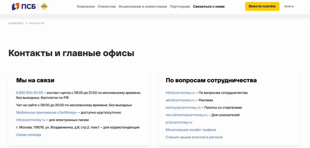 Сервис CarMoney ориентирован на дистанционное обслуживание клиентов, поэтому большинство операций можно выполнить онлайн — через сайт или мобильное приложение. Однако если вы привыкли решать подобные вопросы офлайн, всегда можно посетить офис организации.