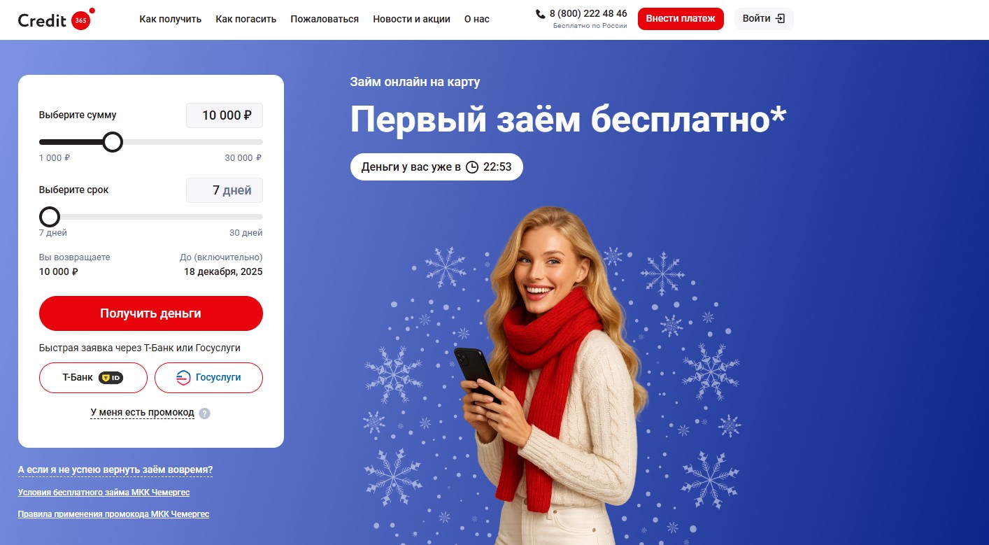 Credit365 — онлайн-сервис, предоставляющий быстрые микрозаймы на карту без визита в офис. Компания автоматизировала процесс выдачи займов: решение принимается за несколько минут, а деньги поступают клиенту сразу после одобрения. «Кредит365» ориентируется на пользователей, которым требуется оперативная финансовая поддержка без сложных требований к документам. Сервис работает круглосуточно и доступен как через сайт, так и через мобильные устройства.