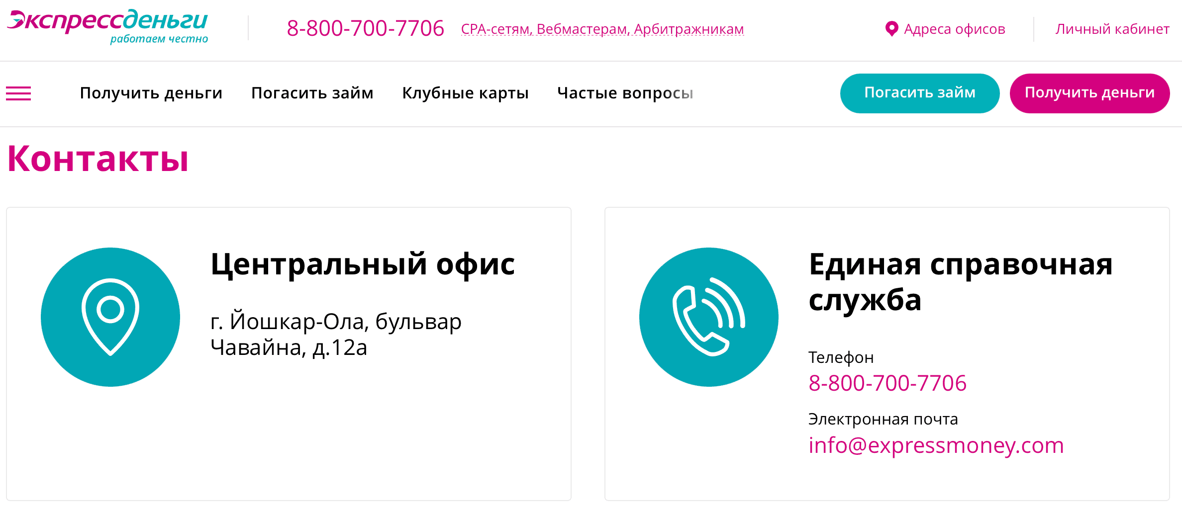 На официальном сайте ЭкспрессДеньги размещён раздел «Контакты», где указаны телефон горячей линии, электронная почта, адрес центрального офиса и реквизиты. В ряде разделов предусмотрена форма обратной связи, через которую можно отправить обращение напрямую.