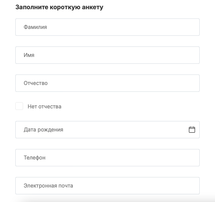 - Заполните обязательные поля краткой анкеты: фамилия, имя, отчество; действующий номер мобильного телефона; адрес электронной почты.