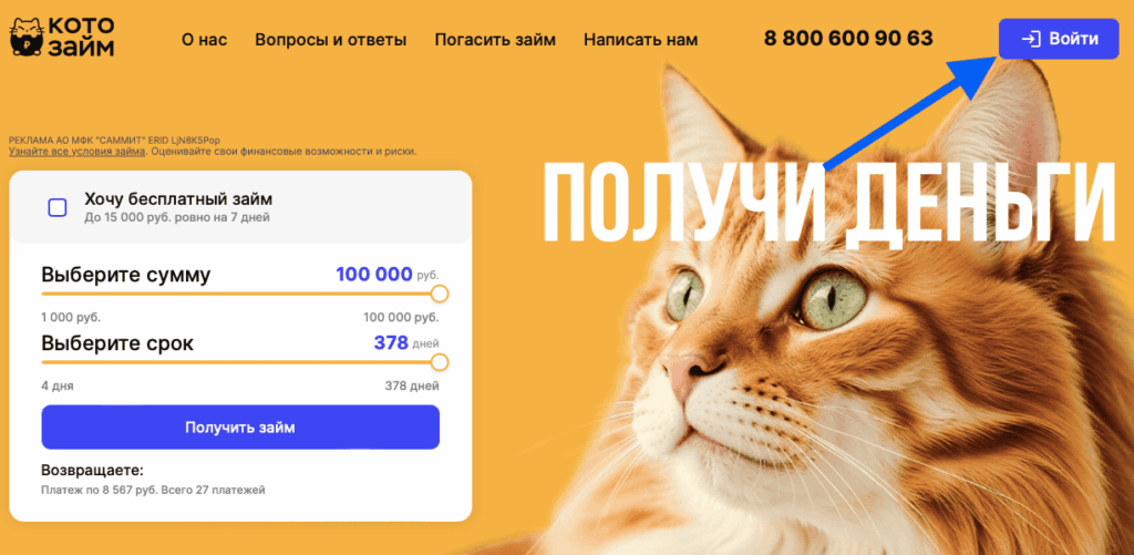 Процесс входа в личный кабинет КотоЗайм стандартен и занимает менее минуты. Все, что требуется для авторизации, — это данные, указанные при регистрации.