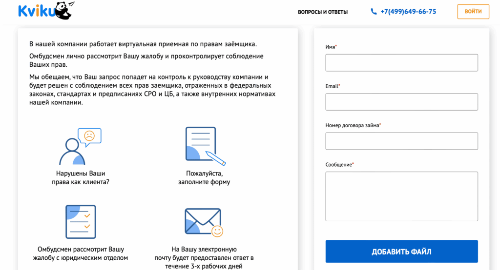 Служба поддержки Kviku консультирует клиентов по большинству вопросов, связанных с оформлением и обслуживанием займа. Обращение возможно как до подписания договора, так и в период его действия.