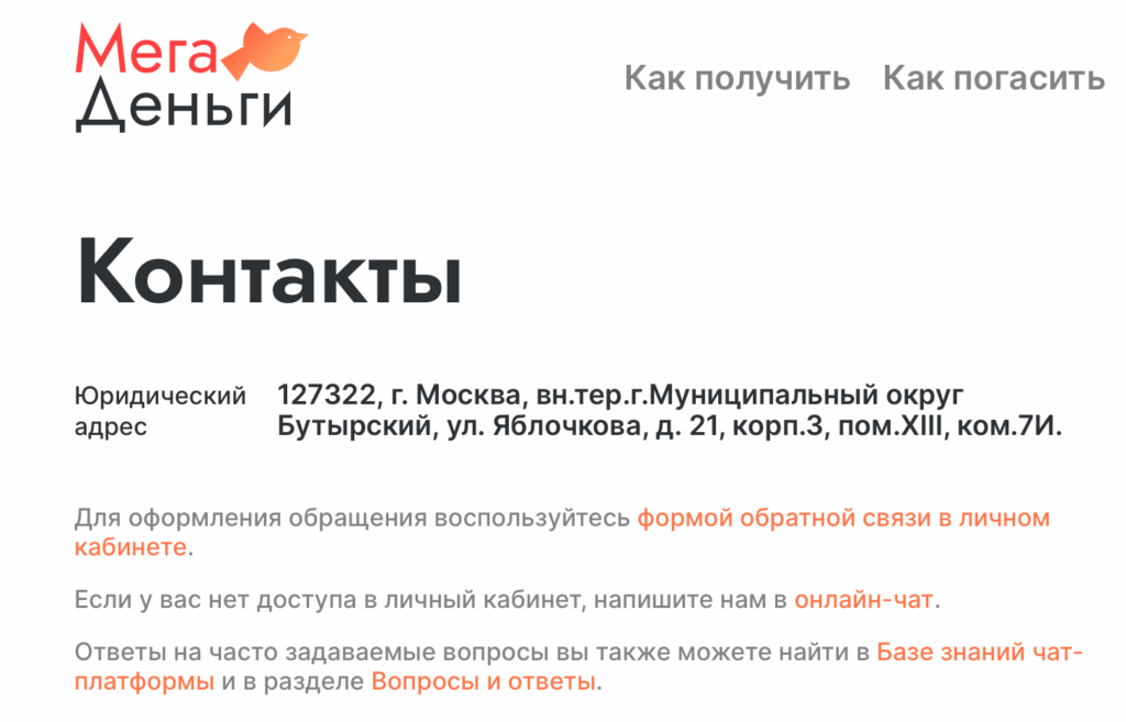 Головной офис Мега Деньги расположен по юридическому адресу компании в Москве. Он выполняет административные и управленческие функции. Основное взаимодействие с клиентами осуществляется дистанционно — через официальный сайт и службу поддержки.