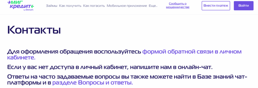 Служба поддержки МигКредит рассматривает широкий круг вопросов, связанных с обслуживанием клиентов и использованием сервиса.